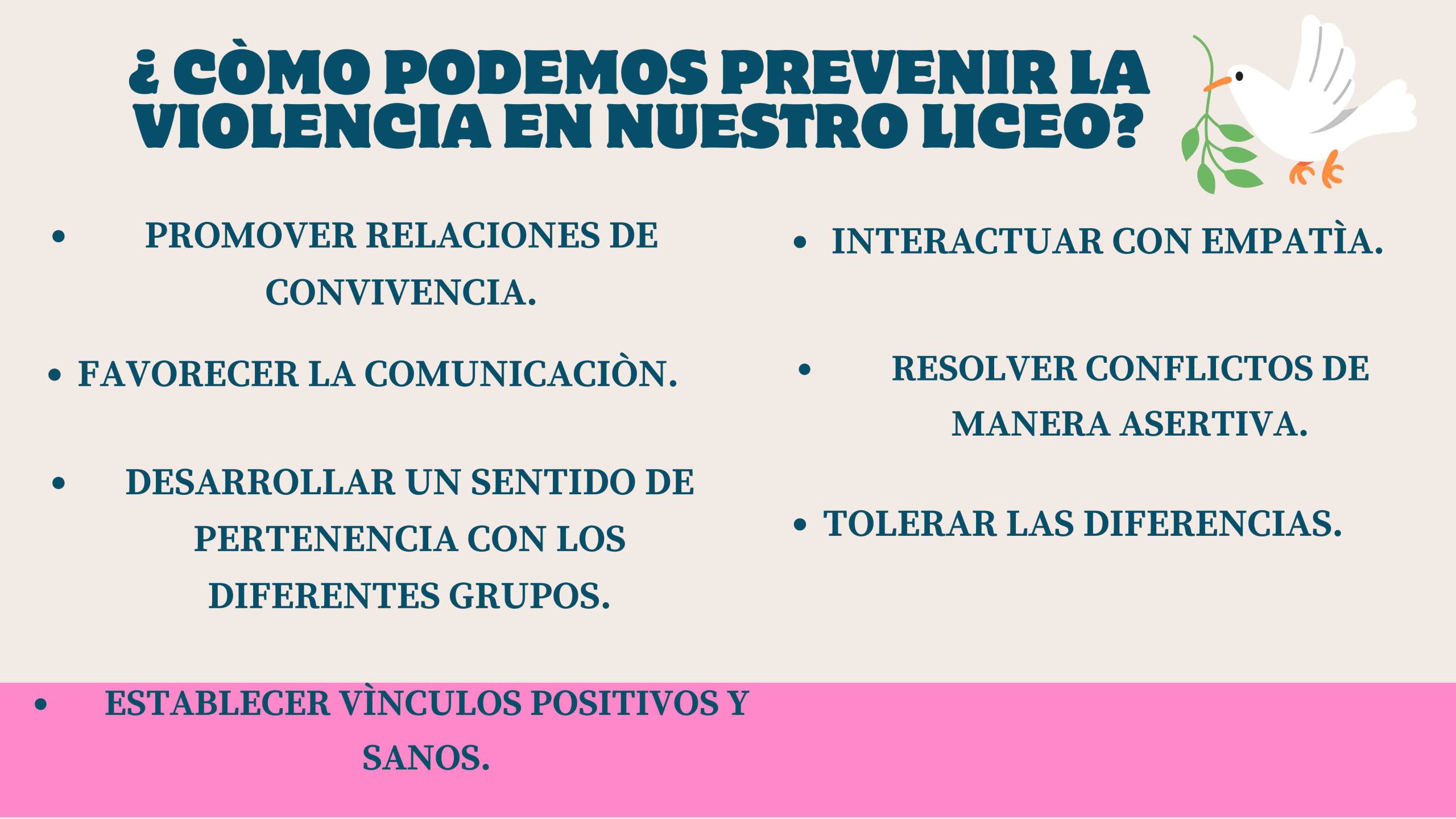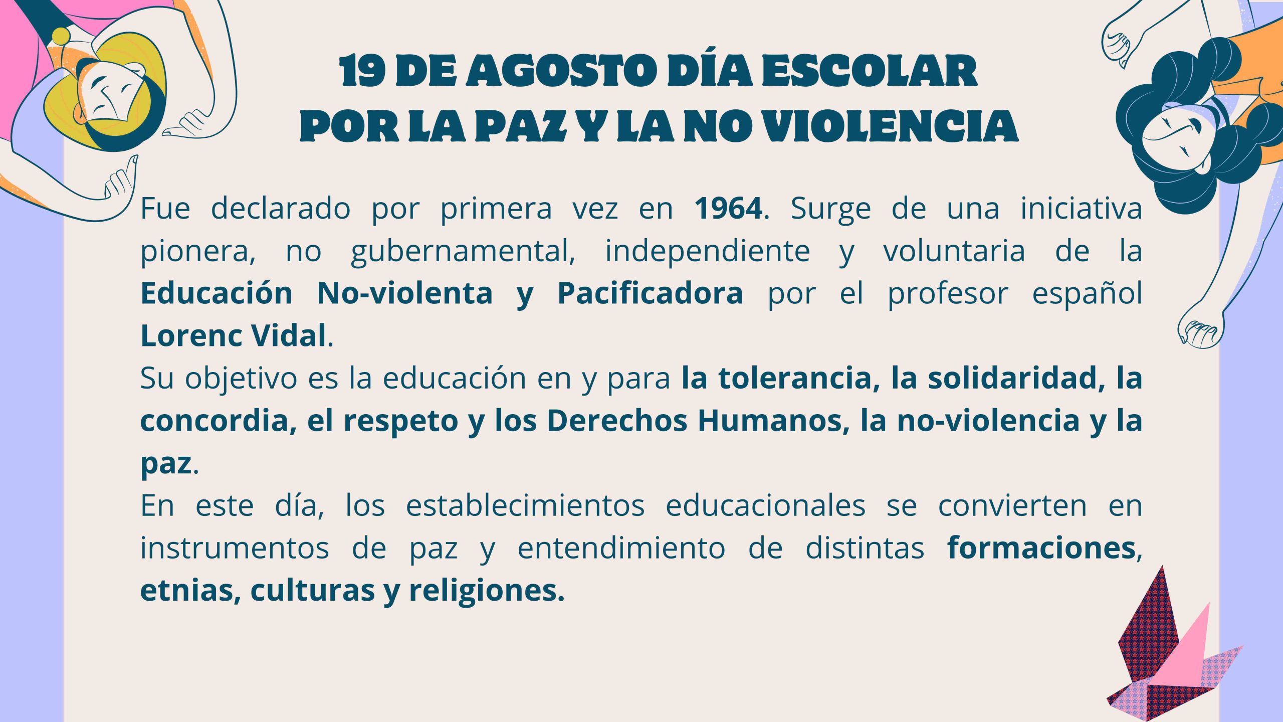 El 19 de agosto celebramos el Día Escolar por la Paz y la No Violencia, una jornada dedicada a fomentar la convivencia pacífica en nuestras escuelas. Este día nos invita a reflexionar sobre la importancia de la empatía, el respeto y la resolución pacífica de conflictos. A través de actividades y charlas, estudiantes y educadores se unen para promover un ambiente de armonía y comprensión, contribuyendo al desarrollo de una sociedad más justa y sin violencia.