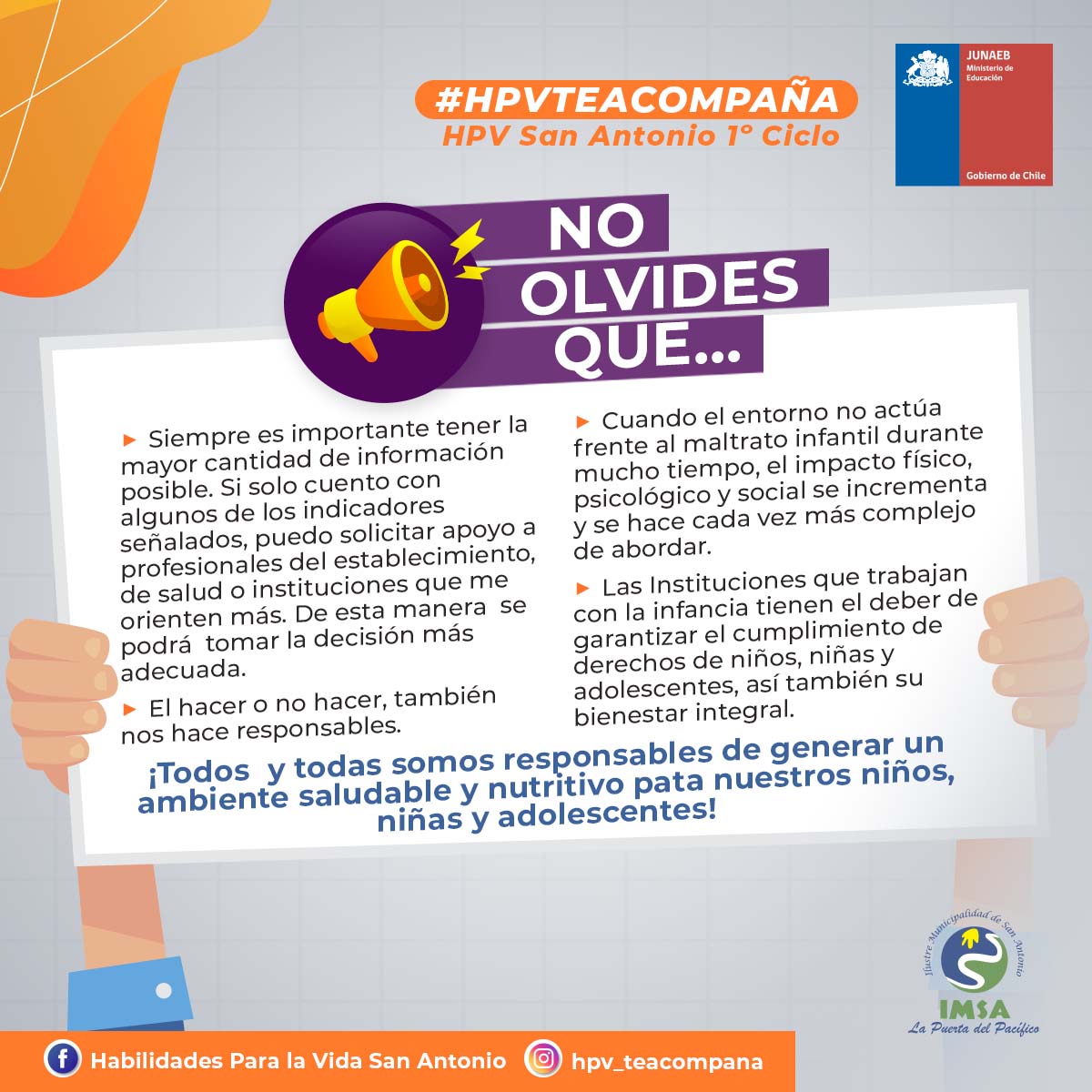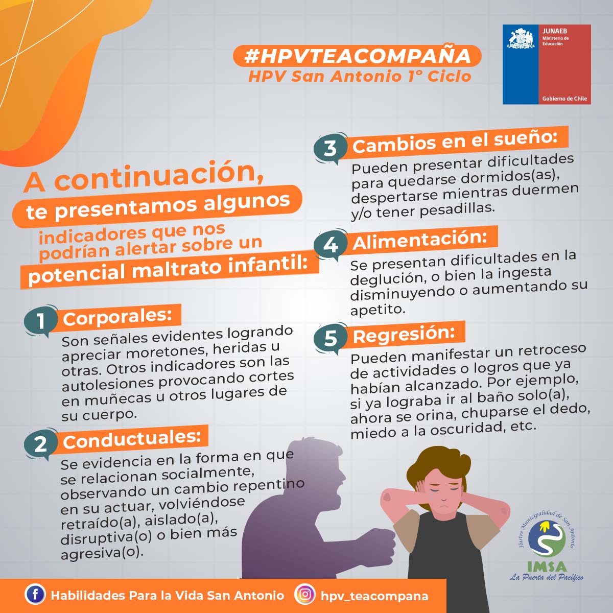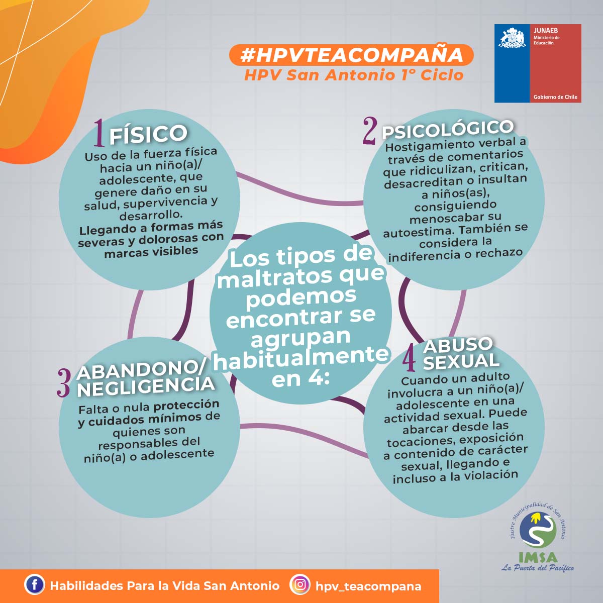 ¡Buen día! Compartimos con ustedes un material de apoyo elaborado por el Programa Habilidades para la Vida, el cual está destinado a orientar y guiar frente a situaciones de maltrato infantil/adolescente, explicando cuales son los procesos de denuncia y los canales apropiados para su correcto proceso.